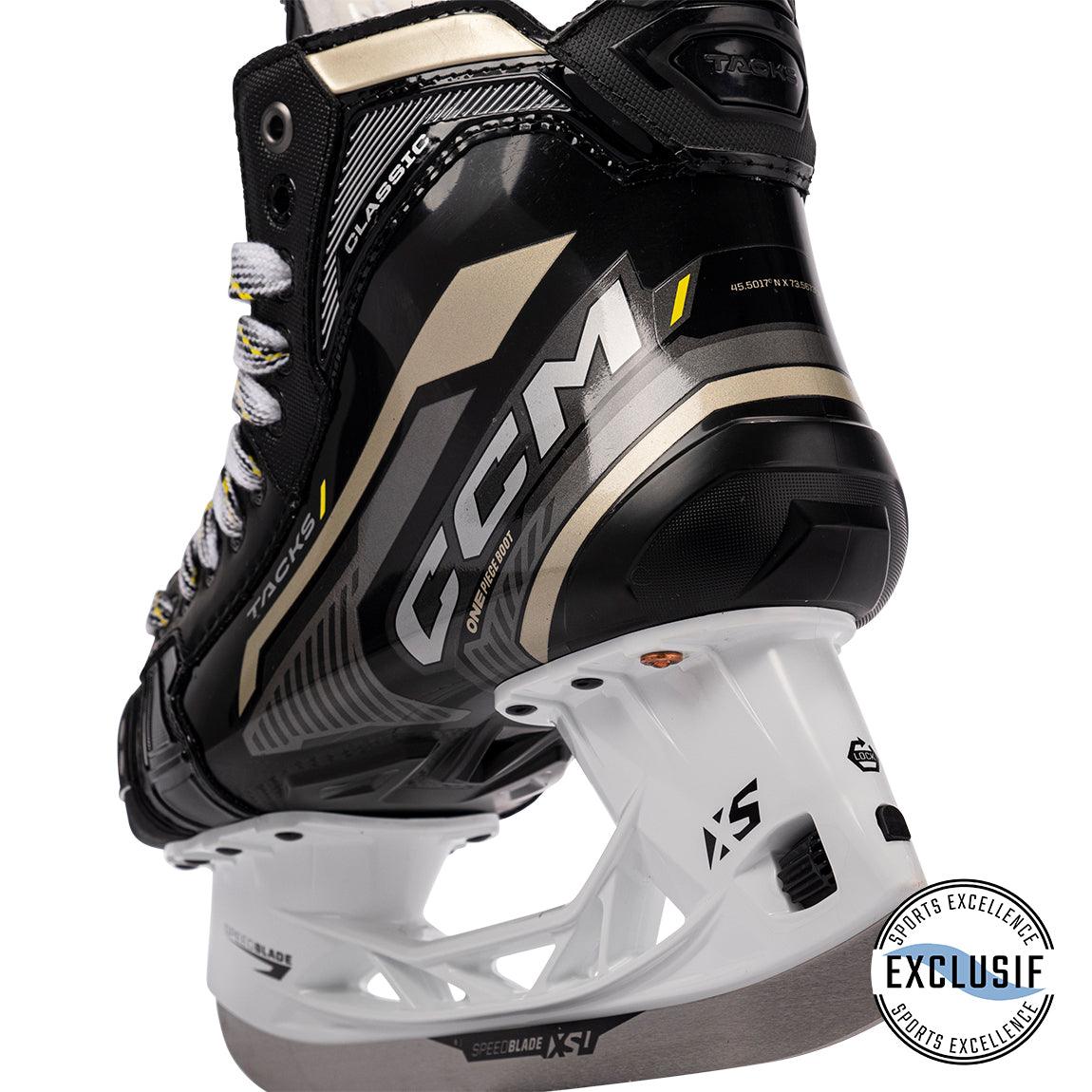 The CCM Tacks Classic skates, exclusively available at Sports Excellence, are based on the AS-570 boot and include One-piece boot technology with enhancements from the AS-590. They feature an XS Stainless runner (SR-INT-JR) and custom color decals on the Junior model.